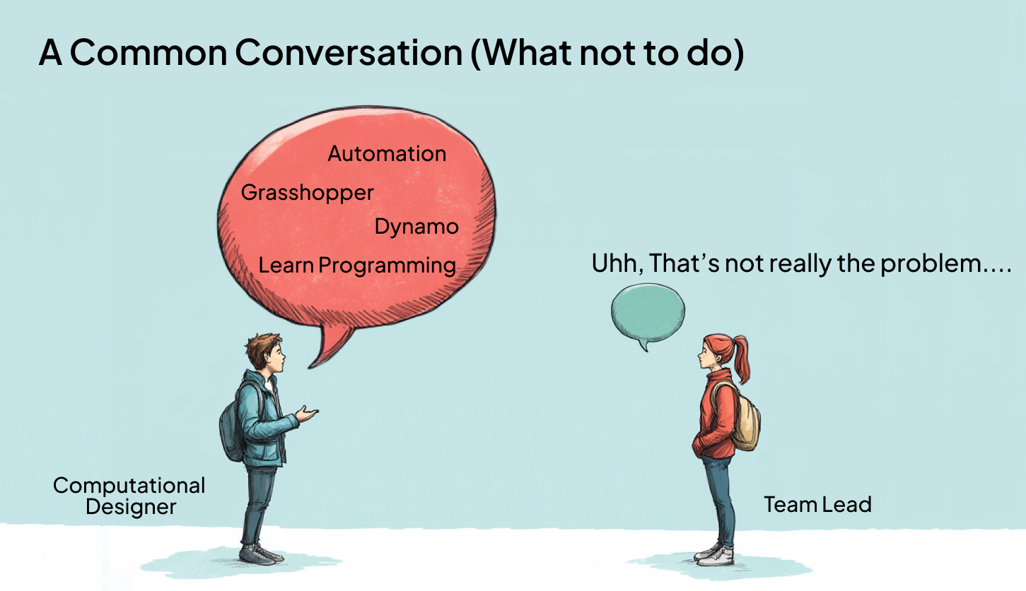 When a computational design person comes in to your team and starts shouting "Grasshopper will change everything" or "Grasshopper will 10X your productivity". You would close off to the noise because it’s too overwhelming. Also, no one has shown them how any of it actually relates to them.