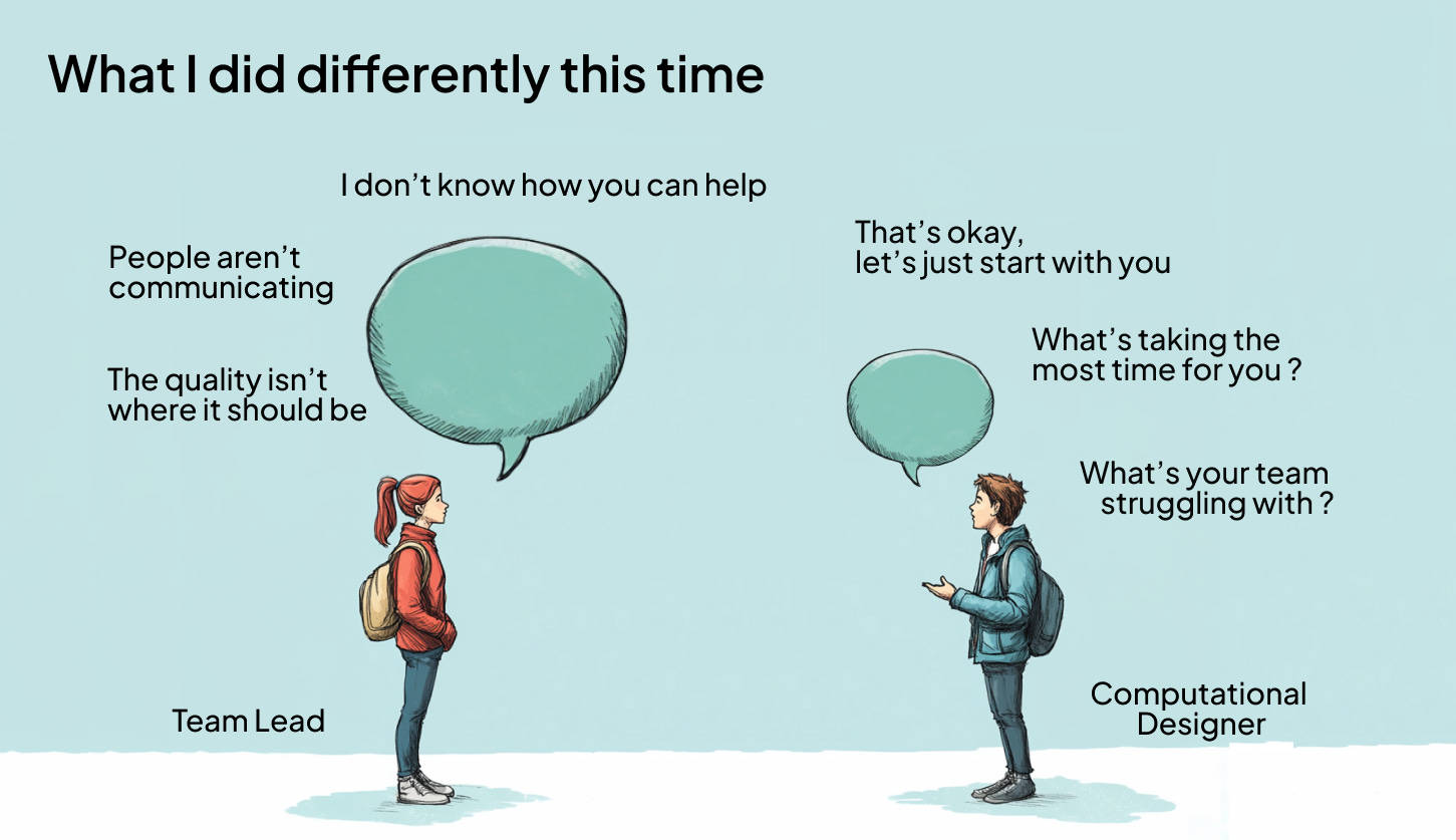 It’s not about pointing fingers, it’s to understand if there was a better way of working for both sides. It's already difficult understanding how computational design can help, you don't want to add the intricacies of inter-team politics on top of that.