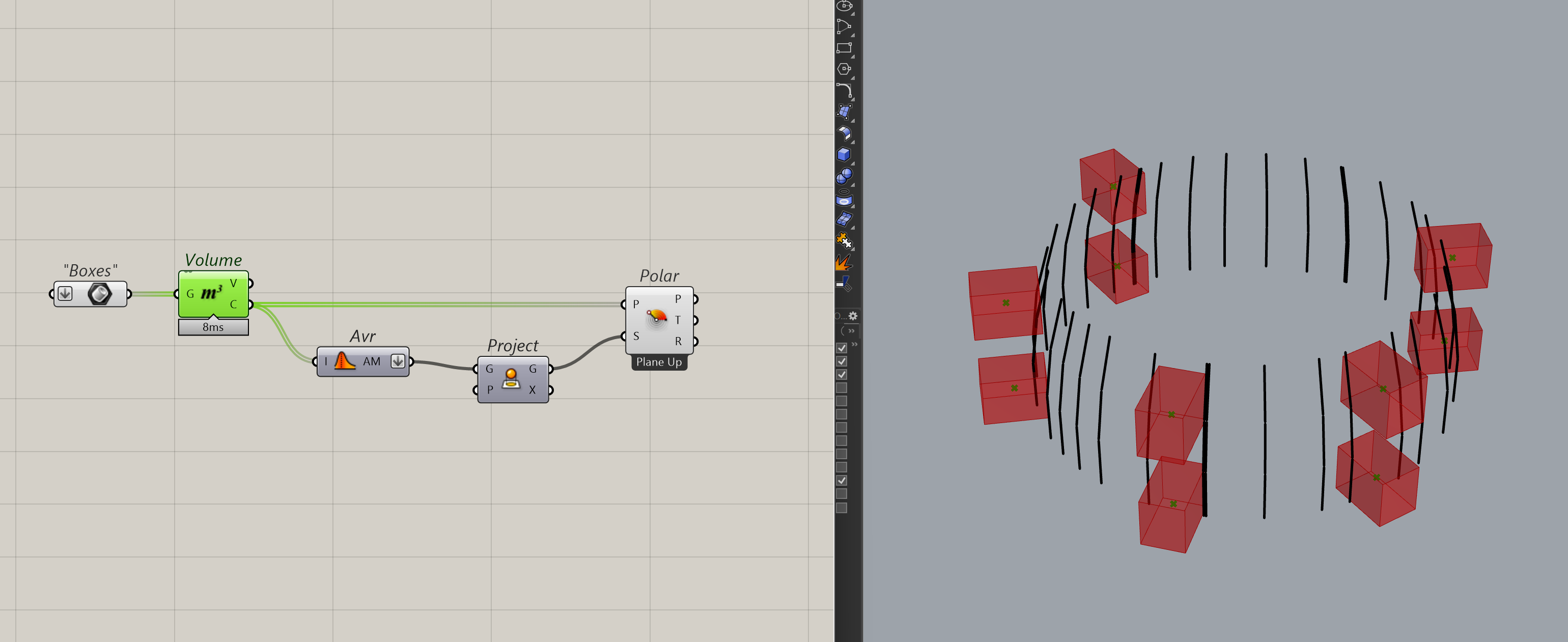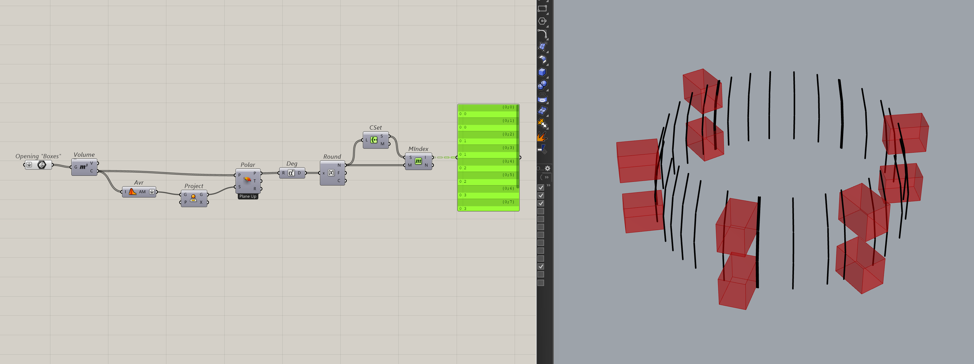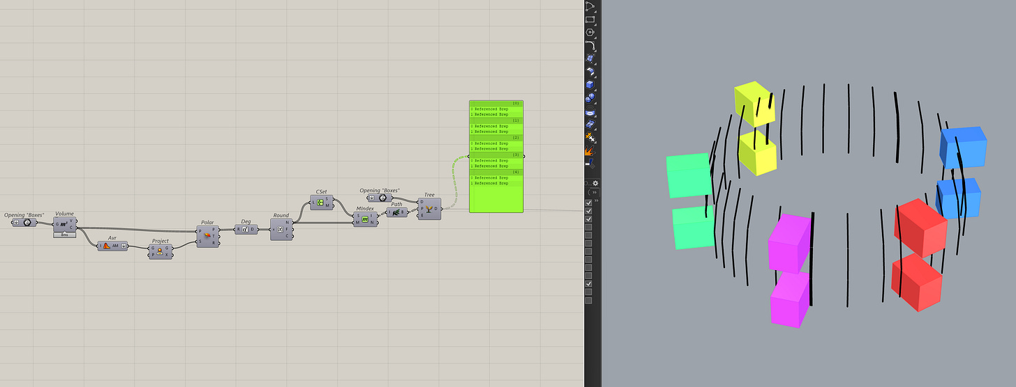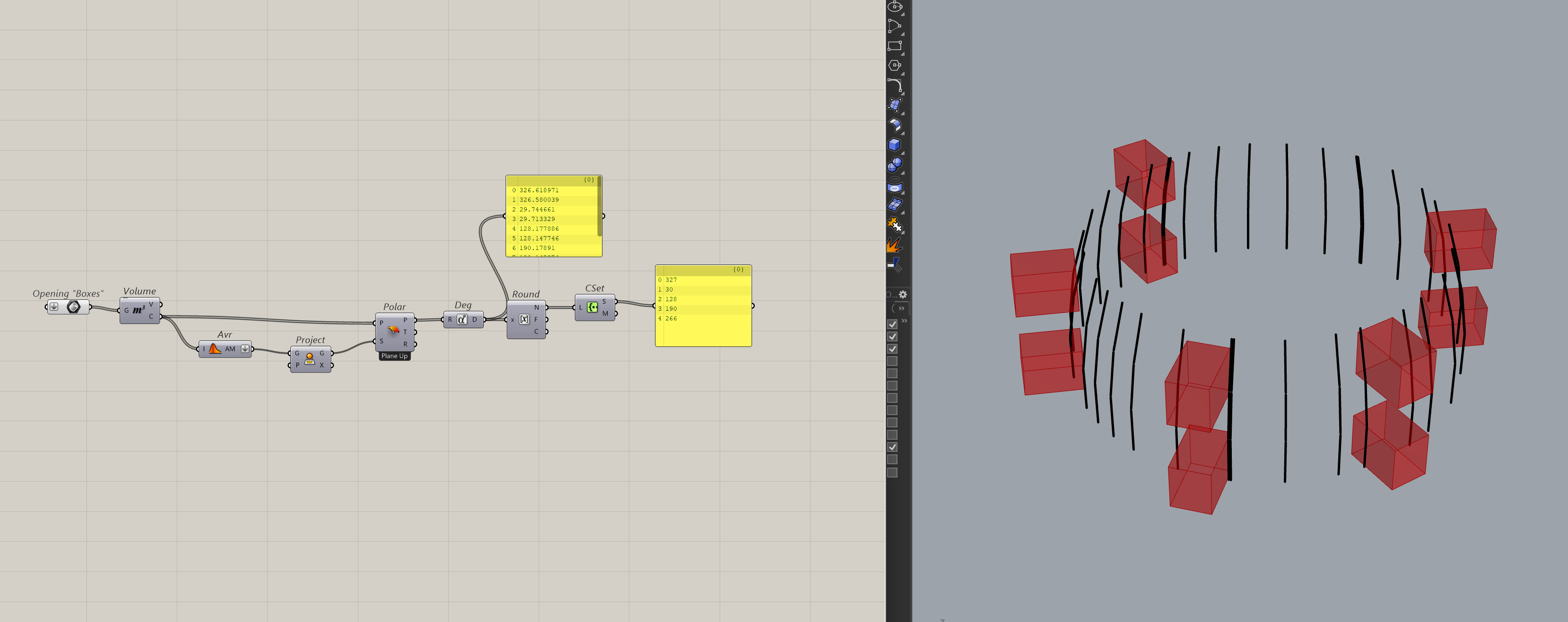 For an example, I have a list of boxes in my model that can be grouped radially. I can get the property of each item in my data-tree by getting it’s centroid and then it’s polar coordinate, the property I want the radial angle.