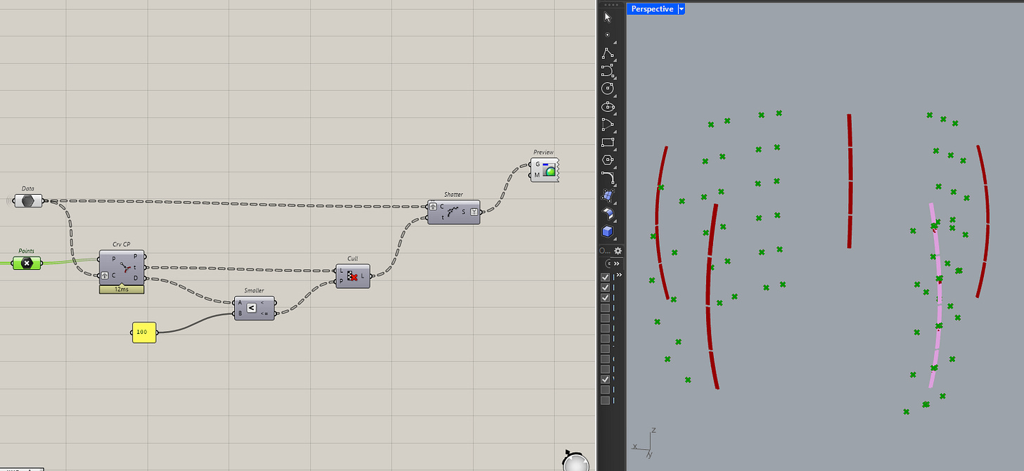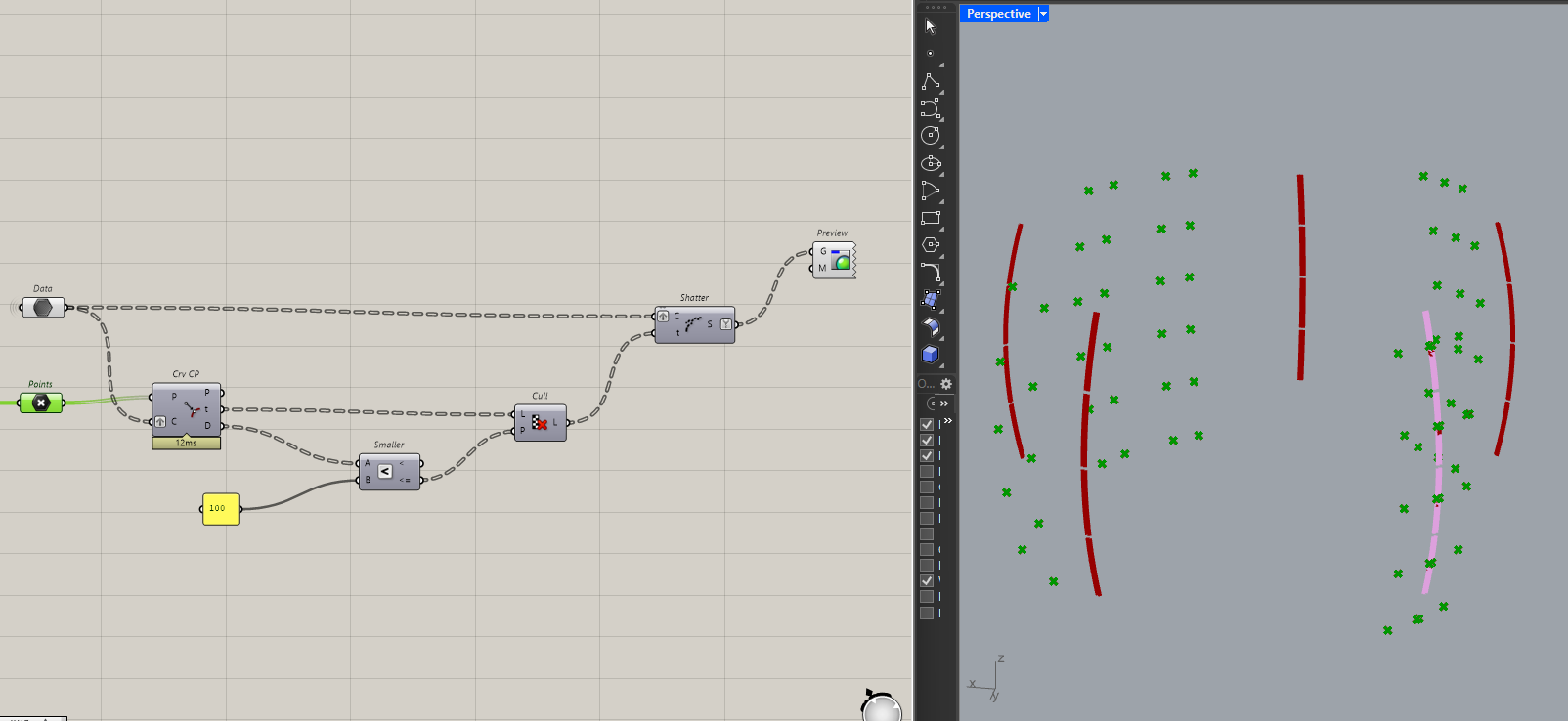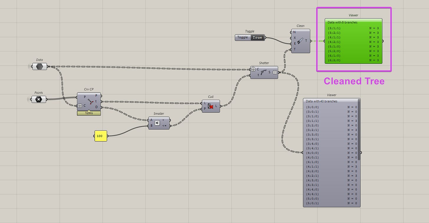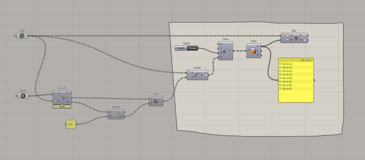 For example, I have a data-tree of curves and a list of points that may or may not be close to the curves. I want to split the curves if the point is close enough. I’ll first check it’s distance and if it’s close enough, I’ll shatter them.