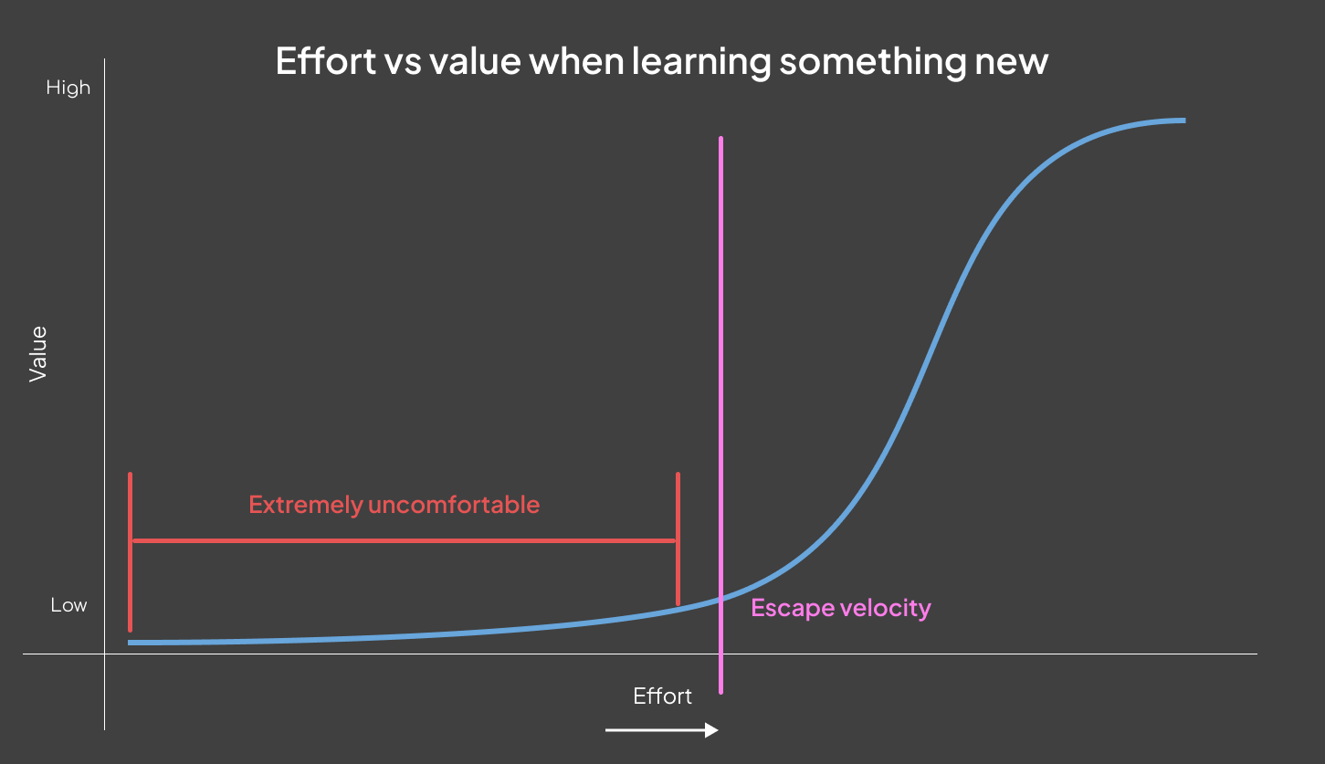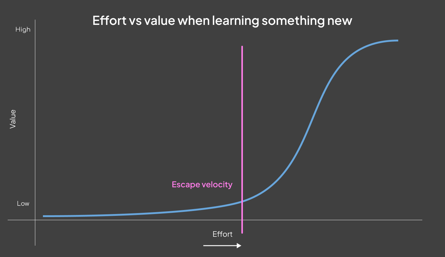 And there will be problems you can’t solve. But slowly, through trying, failing and trying some more, things will get easier. And once you reach escape velocity, learning new things stops being the hard part.