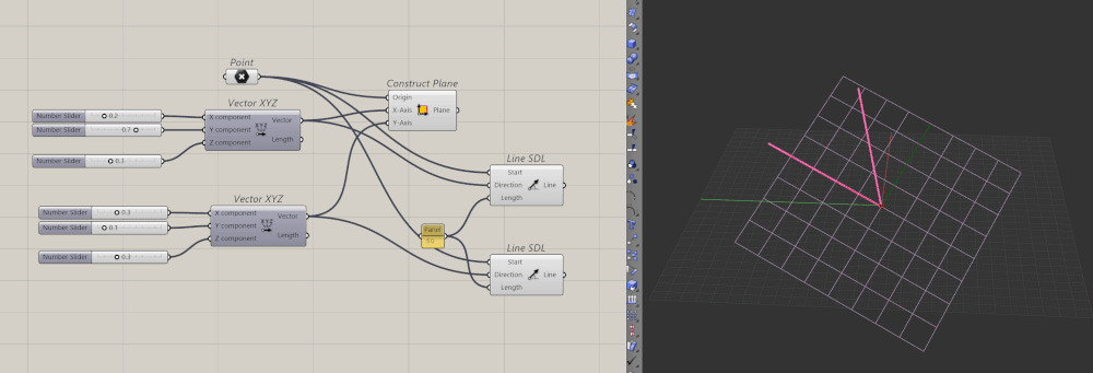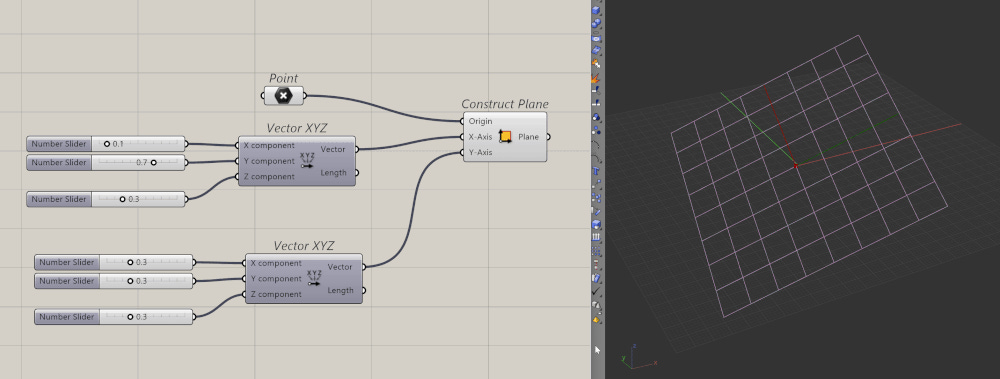 Oh one thing to note here is that your X and Y vectors should be perpendicular to each other (90° apart). But even if they aren't, Grasshopper will still try to create the plane out of the closest perpendicular vectors from your X vector. But that also means the resulting plane will be unpredictable, so it's best to always be explicit with your vectors.