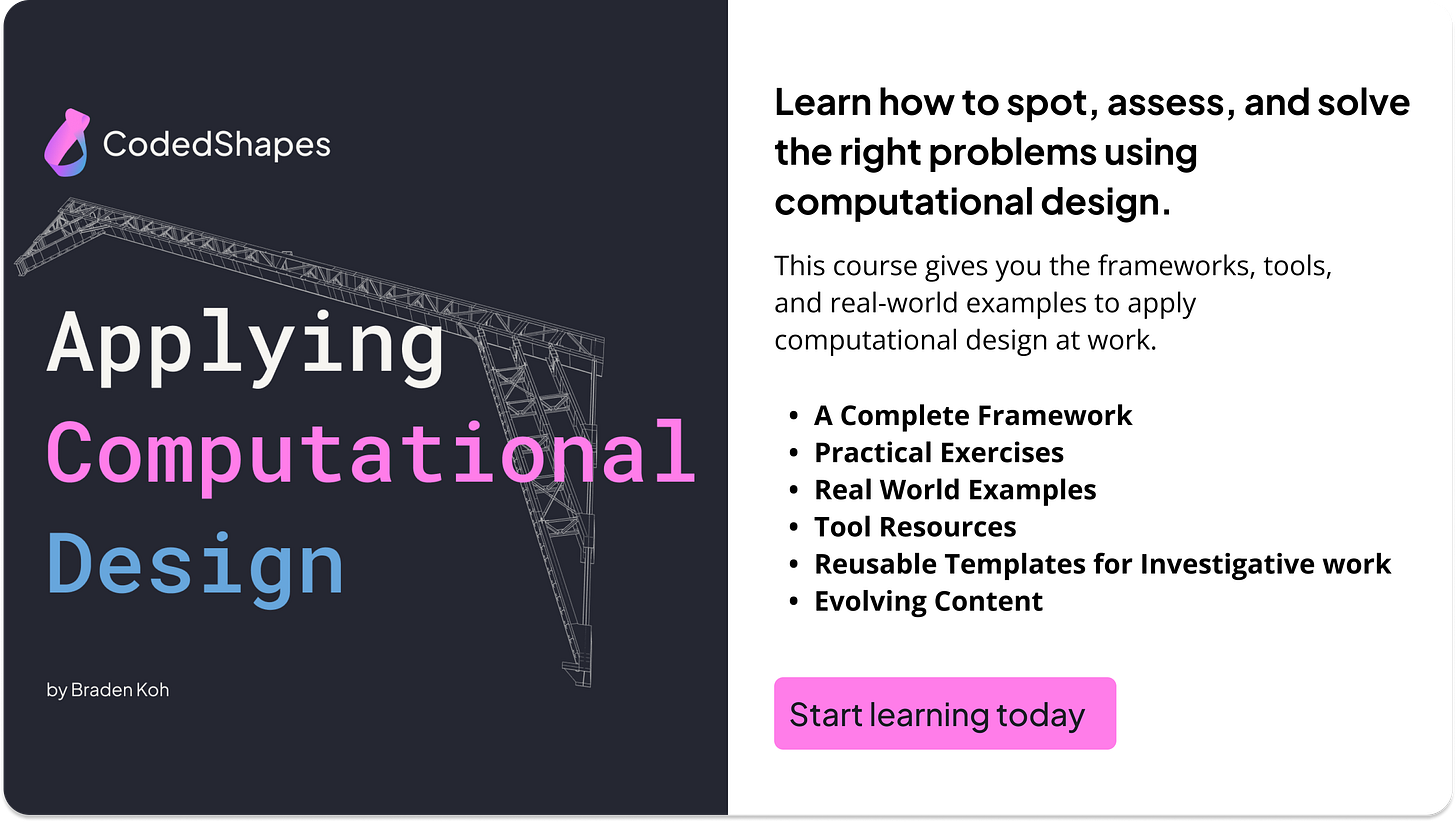 That’s the goal of my new course. It’s not a tutorial on Grasshopper or a walkthrough on Dynamo. It’s a way to help you see and spot problems that computational design can meaningfully solve in your world. And don’t worry, it doesn’t cost your salary.
