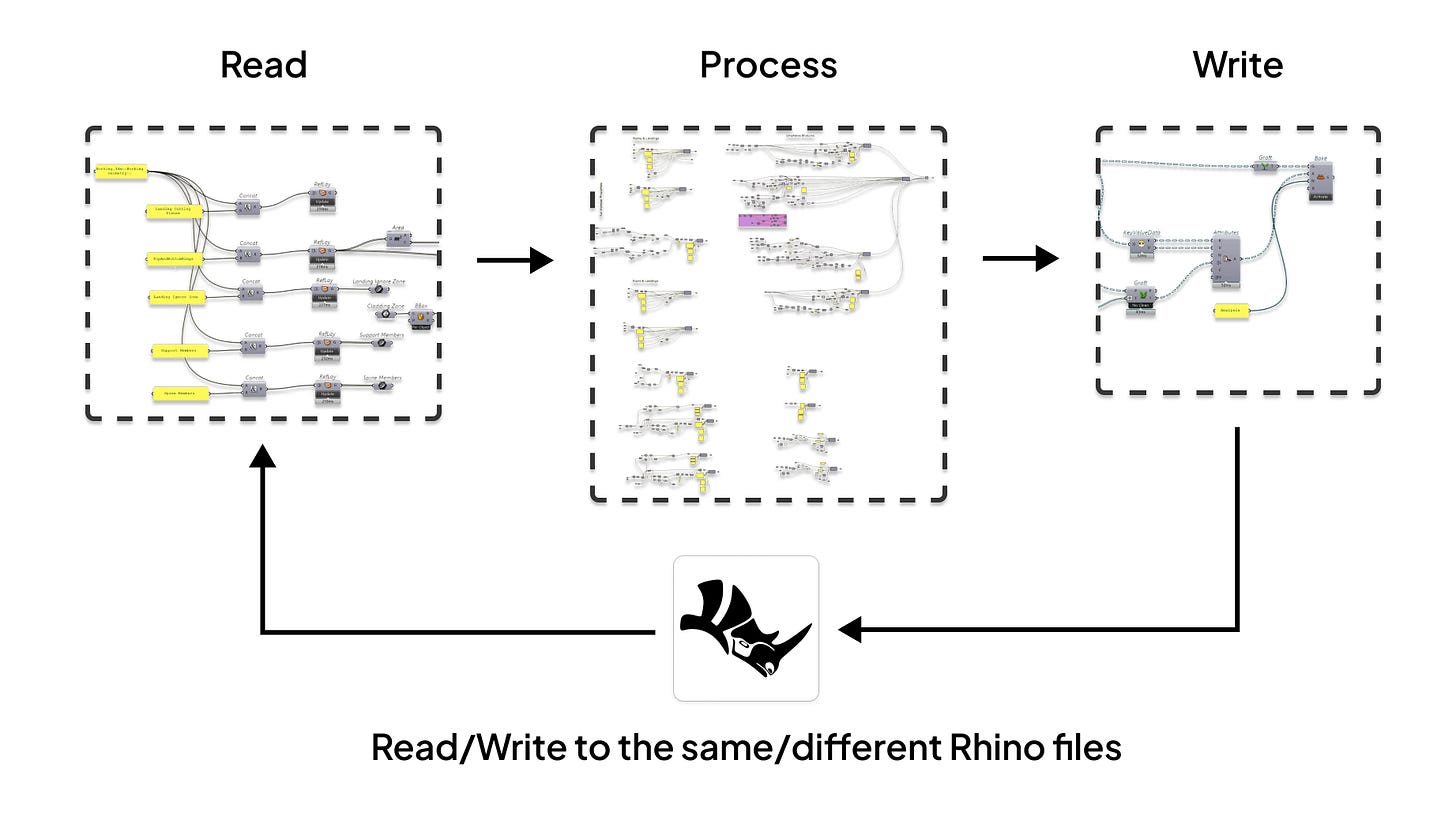 It turns out, having a consistent way to read/write data out means we have a way to store our data between scripts. Reading and writing to Rhino sounds like a small thing but it’s really what let’s us create this modular workflow with smaller scripts.
