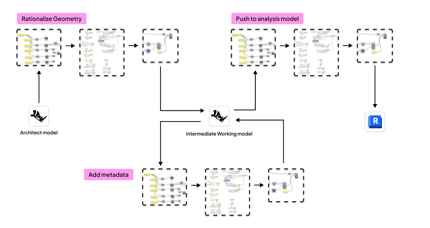 But because it was valuable, we kept adding more to it. Since we already had the rationalized geometry, it was only a few more steps to push that into the an analysis program. Oh, and since we can already do the analysis model, adding more metadata for a Revit model is only a few more steps again.....