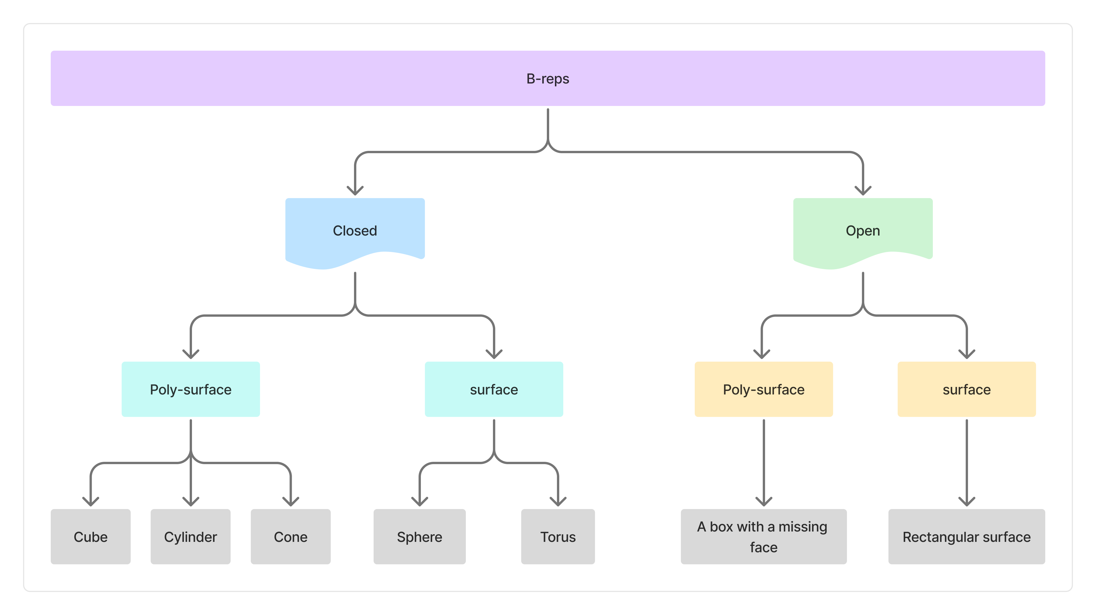 Whether it’s a surface, box, polysurface, or extrusion , they’re all B-reps under the hood. Rhino just gives them friendlier names depending on how they were created.